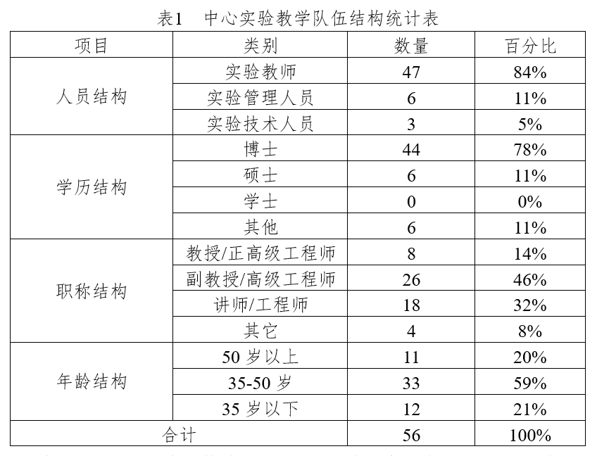 目前,中心已拥有一支品德高尚、教学和管理水平高、队伍结构合理的实验教师队伍。现有实验教师47人(教授8人、副教授26人,其中具有博士学位者44人);实验管理人员6人(工程师5人);实验技术人员3人;中心实验教学队伍整体结构情况如表1所示: