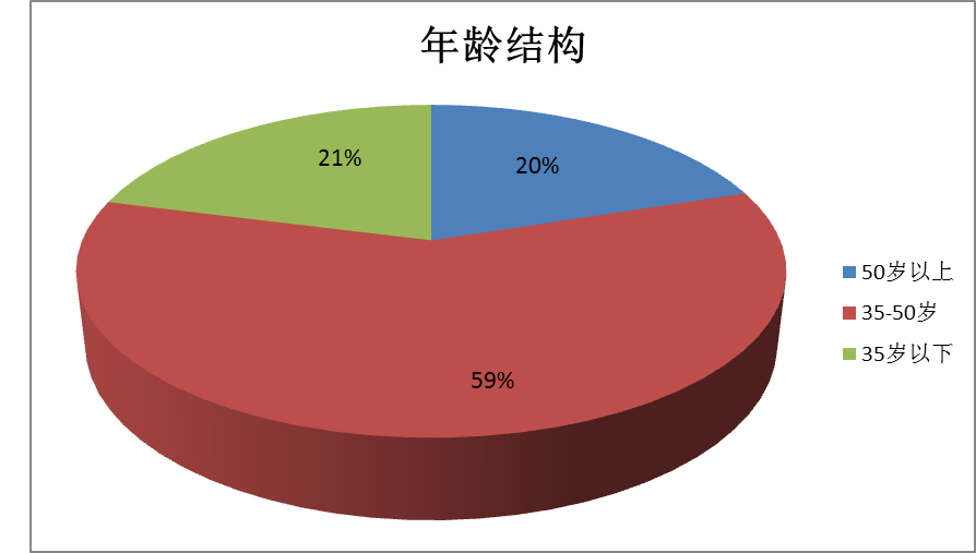 中心队伍在年龄结构方面:50以上教师占20%,35-50岁教师占59%,35岁以下教师占21%(如图3),队伍平均年龄约42岁,形成以中青年教师为骨干的年轻化梯级实验教学管理队伍,有助于实验教学的改革发展。